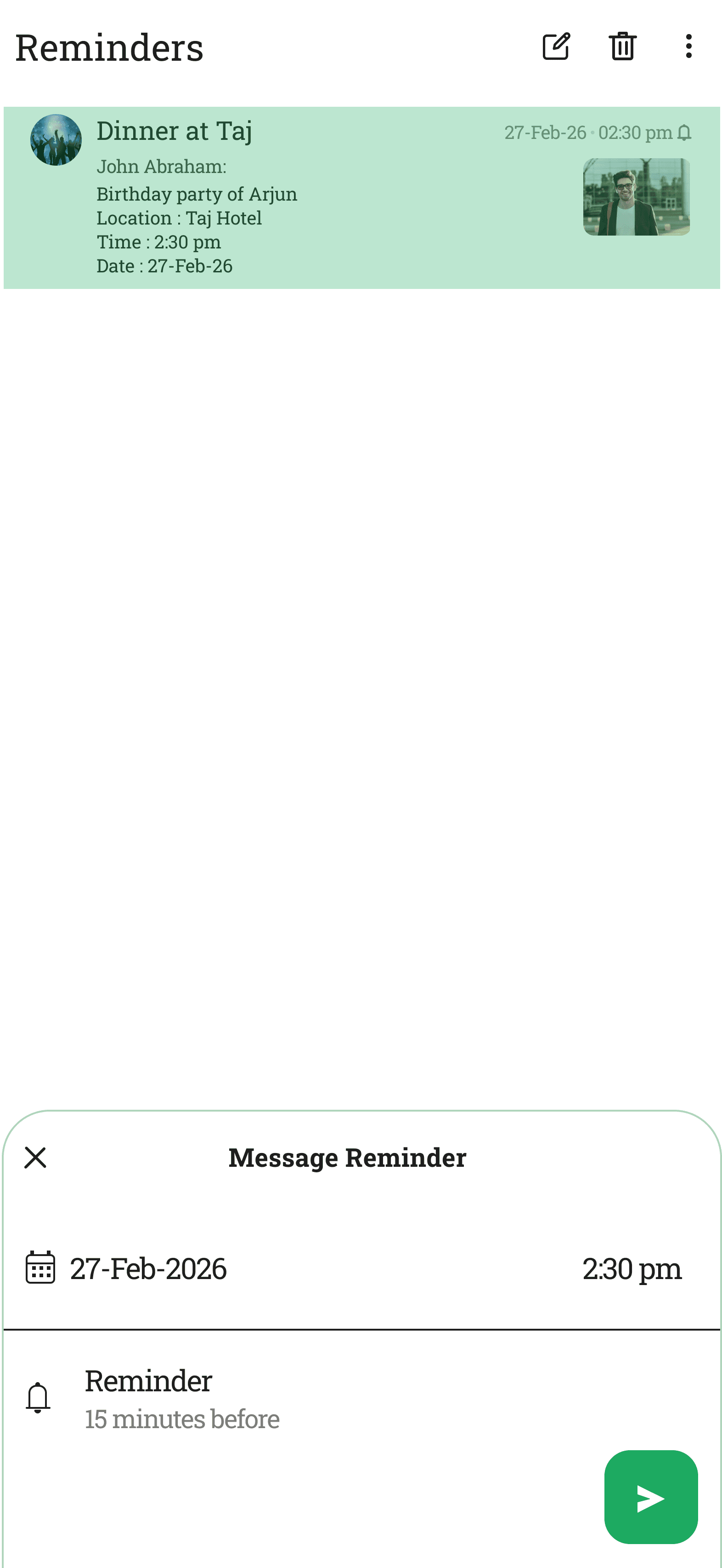 A dedicated "Reminders" tab accessible from the main navigation menu — similar to how Starred Messages works today. A central place to review, edit, or delete upcoming reminders.